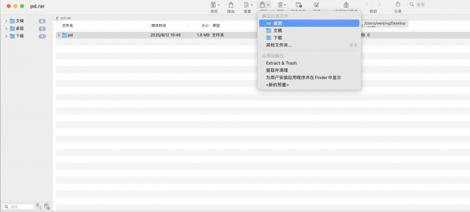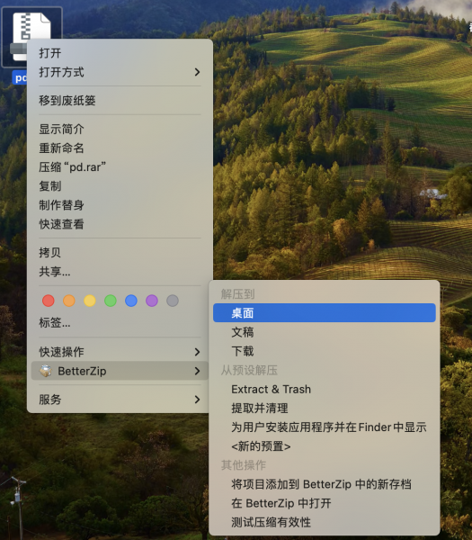4、BetterZip打开RAR的方式还可以在右键菜单的BetterZip菜单中直接解压到桌面。
