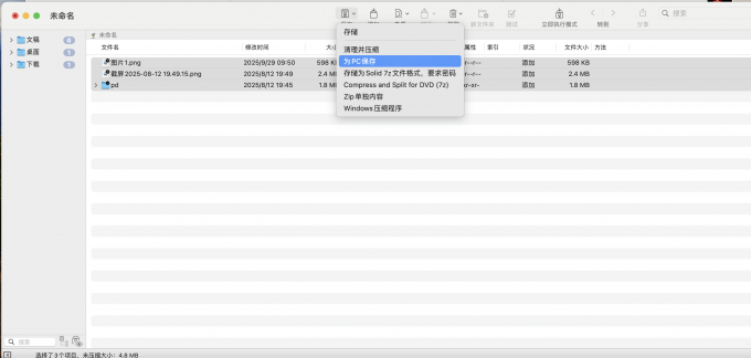 2、全选所有要压缩的文件,并点击顶部菜单栏中的“保存”,从下图看出,BetterZip为方便用户使用提前增加了一些文件压缩的预设,有存储、清理并压缩、为PC保存、存储为7z文件格式并加密等。我们选择“为PC保存”,可以进行一些文件压缩的设置。
