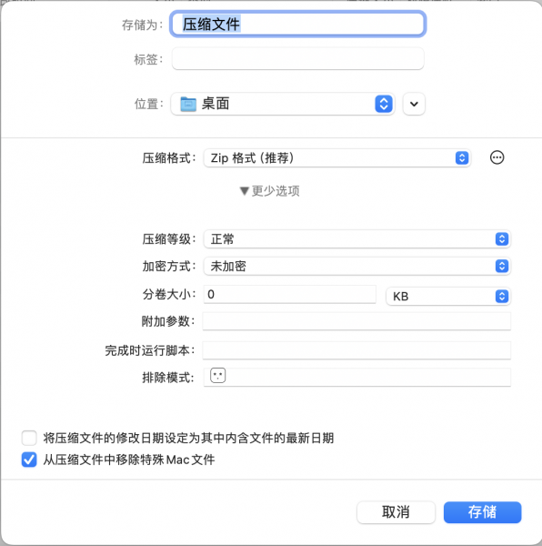 3、以下菜单中是BetterZip对压缩文件几个基本设置,包括压缩文件的名称、存储文件位置,希望压缩的格式和压缩等级以及是否选择加密压缩等。我们按照文件需求设置,然后点击存储,保存已经压缩好的文件即可。